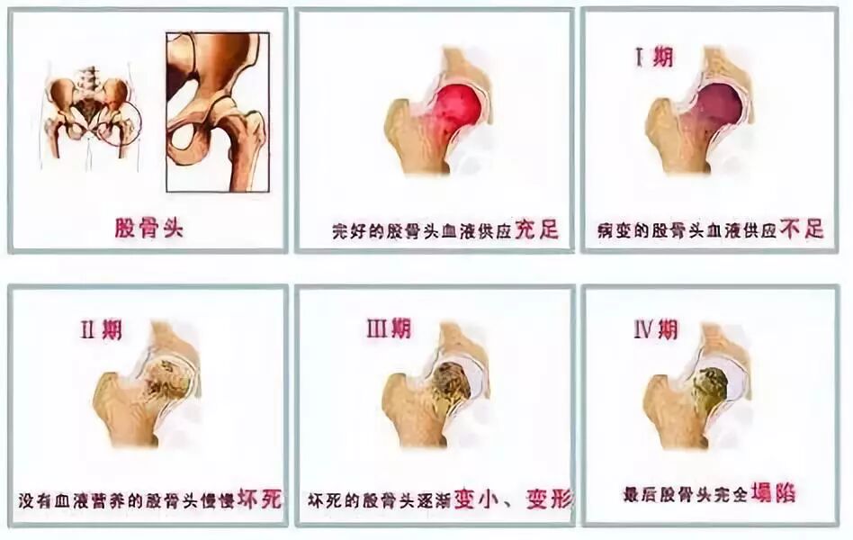0期 活检结果符合坏死,其它检查正常 I期 骨扫描或(和)MRI异常 A 轻度:<15% B 中度:15%~30% C 重度:>30% II期股骨头斑片密度不均、硬化与囊肿形成,X线片骨质密度降低,X线片或CT未见股骨头塌陷,磁共振与骨扫描异常,髋臼无改变 A 轻度:<15% B 中度:15%~30% C 重度:>30% III期正侧位片看到新月征 A 新月征长度<15%关节面或者塌陷<2mm B 新月征长度15%~30%关节面或者塌陷2~4mm C 新月征长度>30%关节面或者塌陷>4mm IV期 关节面变扁、间隙狭窄、髋臼出现坏死硬化、囊型变和边缘骨赘。 一期:病变处于早期,结果和形态无明显变化,血管过多区分,骨与骨髓均无变化。 二期:坏死进展期,可见坏死组织崩溃,且周围出现组织修复,坏死组织的形态改变更加明显,x线片可见骨硬化现象。 三期:坏死修复期:x线片上可见不规则的致密影,骨密度减低区和增高区相间。 四期:后期表现,出现股骨头塌陷,虽经修复,但是新生骨小梁排列不齐,形态不一,粗细不等。x线下关节变形激发挂关节炎表现。